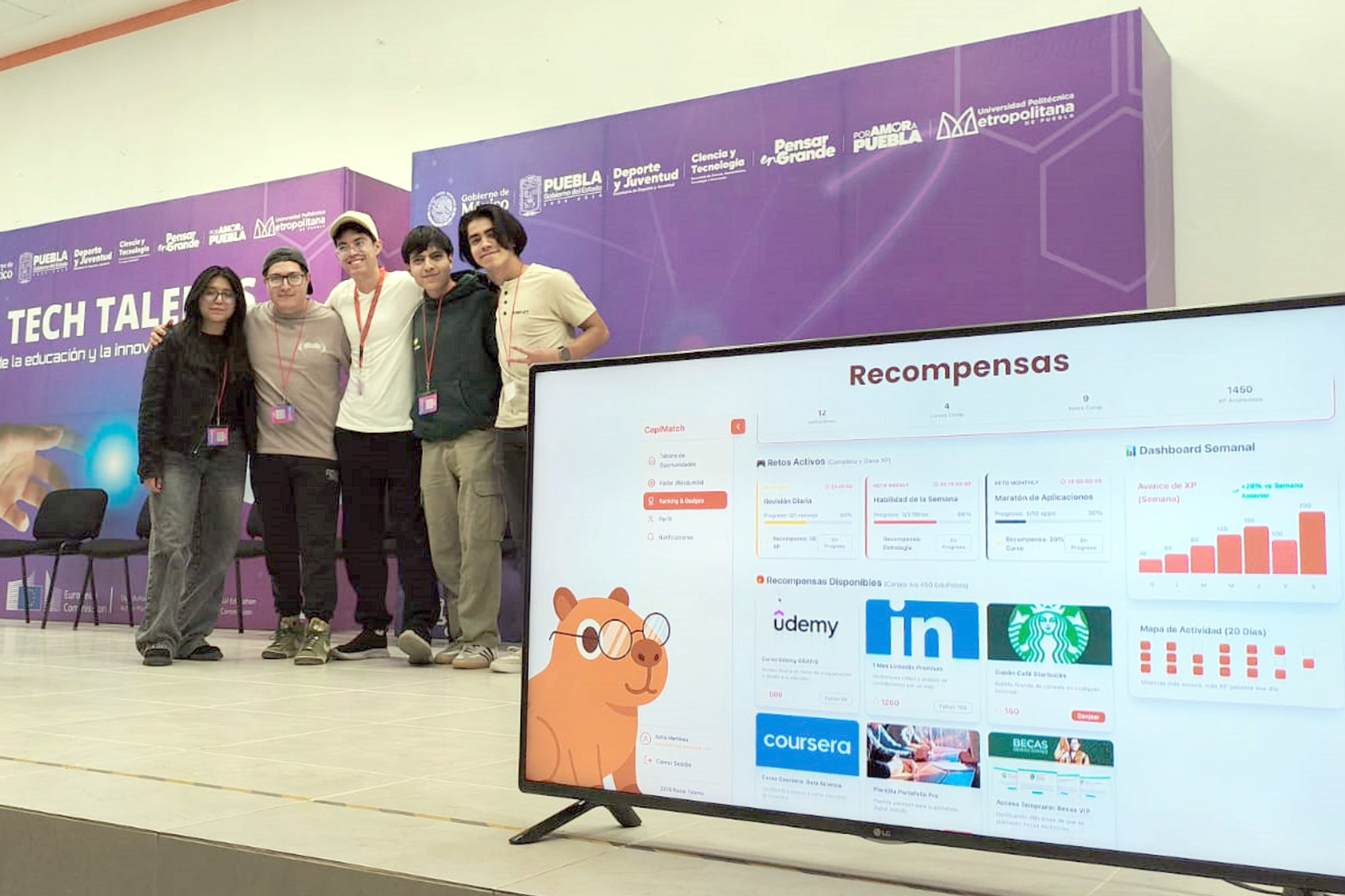 Érika Amastal Xochimitl, Axel Armando Tapia Urbina, Antonio Zempoaltecatl Navarro, Eduardo Guerra Bedolla y Diego Eduardo Jiménez Bautista, estudiantes de la Facultad de Ciencias de la Computación (FCC) de la BUAP, obtuvieron el primer lugar en el Hackathon de Educación Digital (DigiEduHack) 2025, competencia internacional de la Comisión Europea que busca fomentar la innovación y colaboración, así como impulsar un cambio positivo en la educación a través de la tecnología.