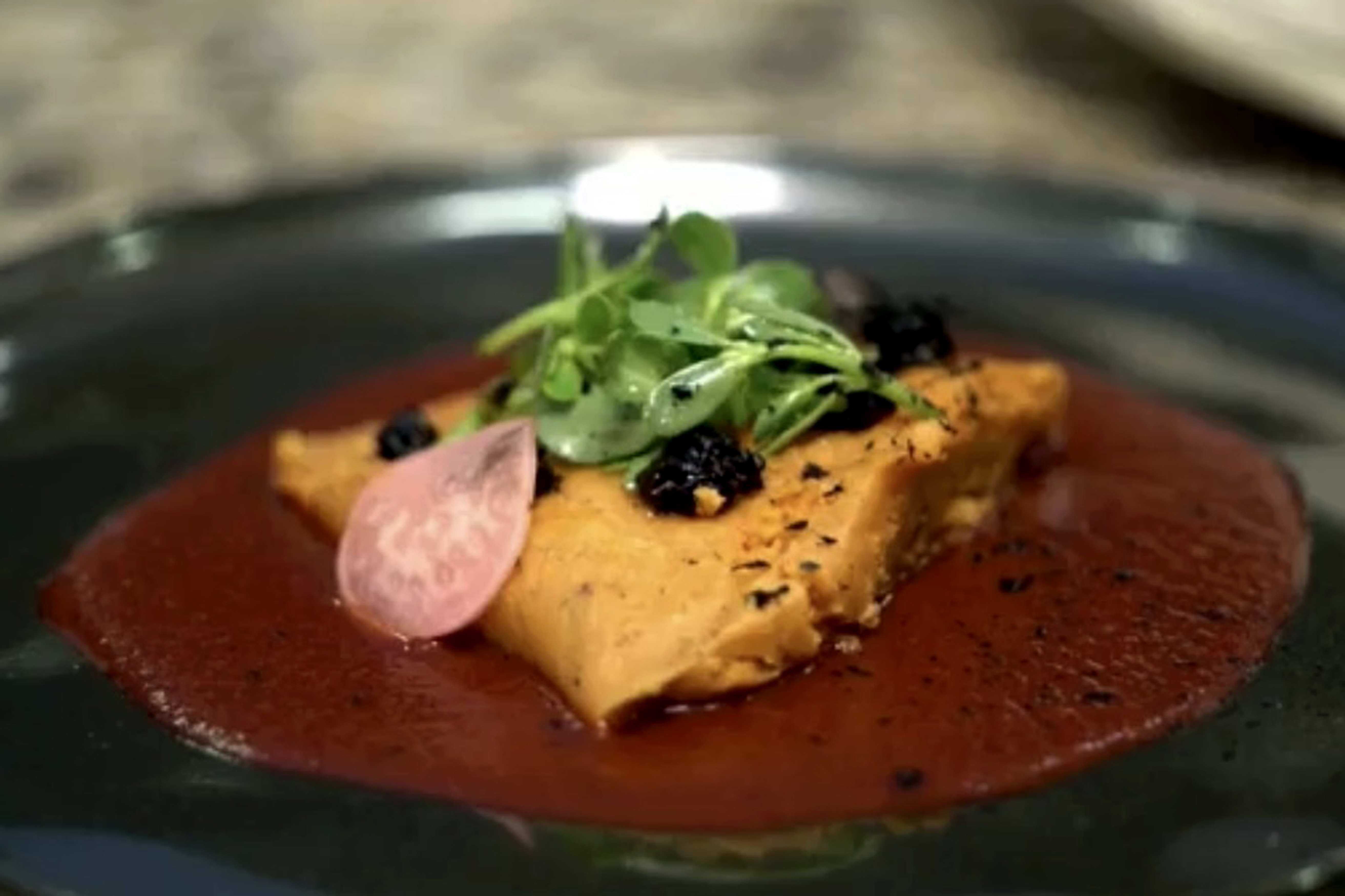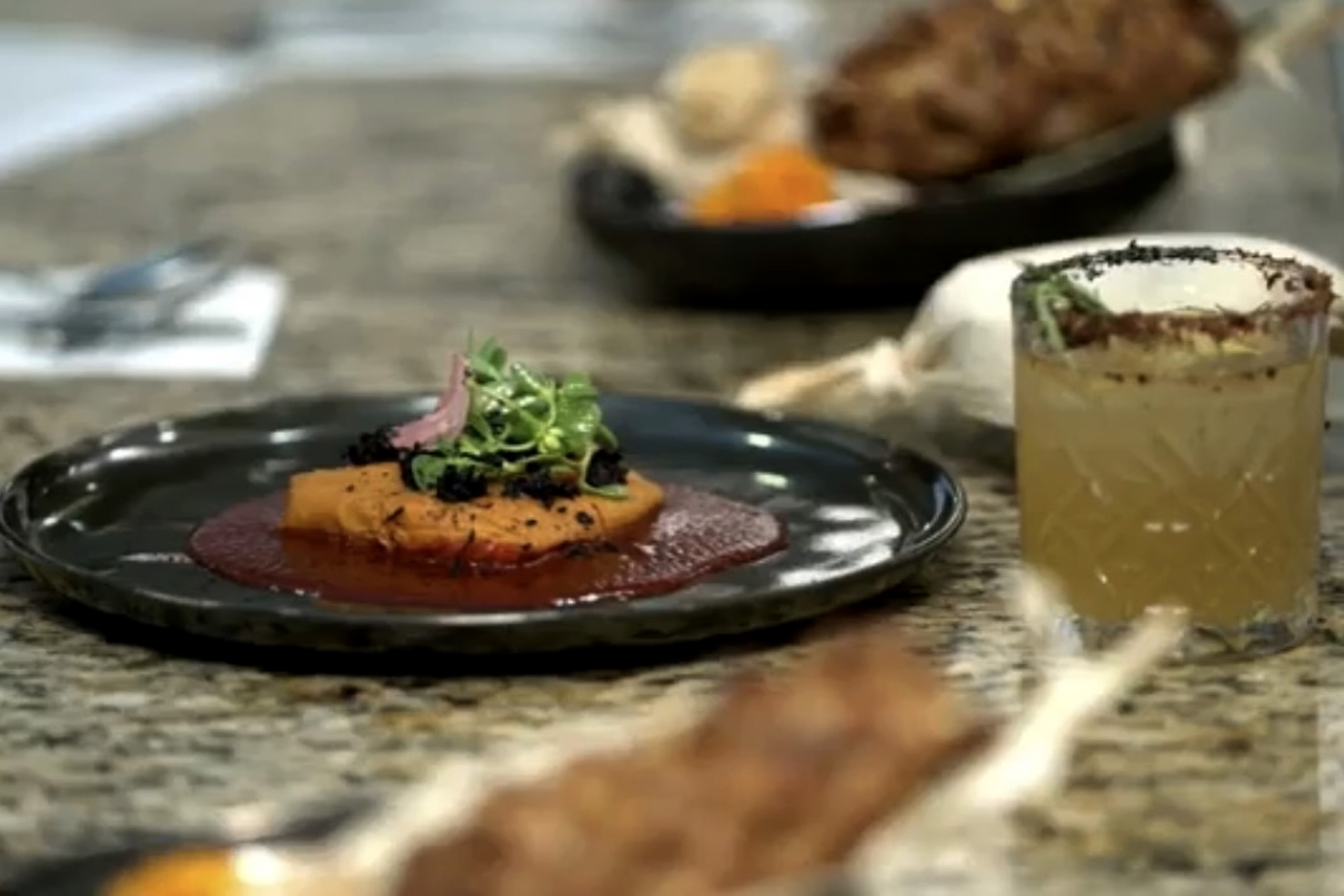 Para acompañar el tamal de cazuela, prepararon un cóctel a base de tepache de guayaba y mezcal espadín, endulzado con piloncillo y jugo de limón, escarchando el vaso con sal de chapulín, tortilla quemada y guayaba confitada.