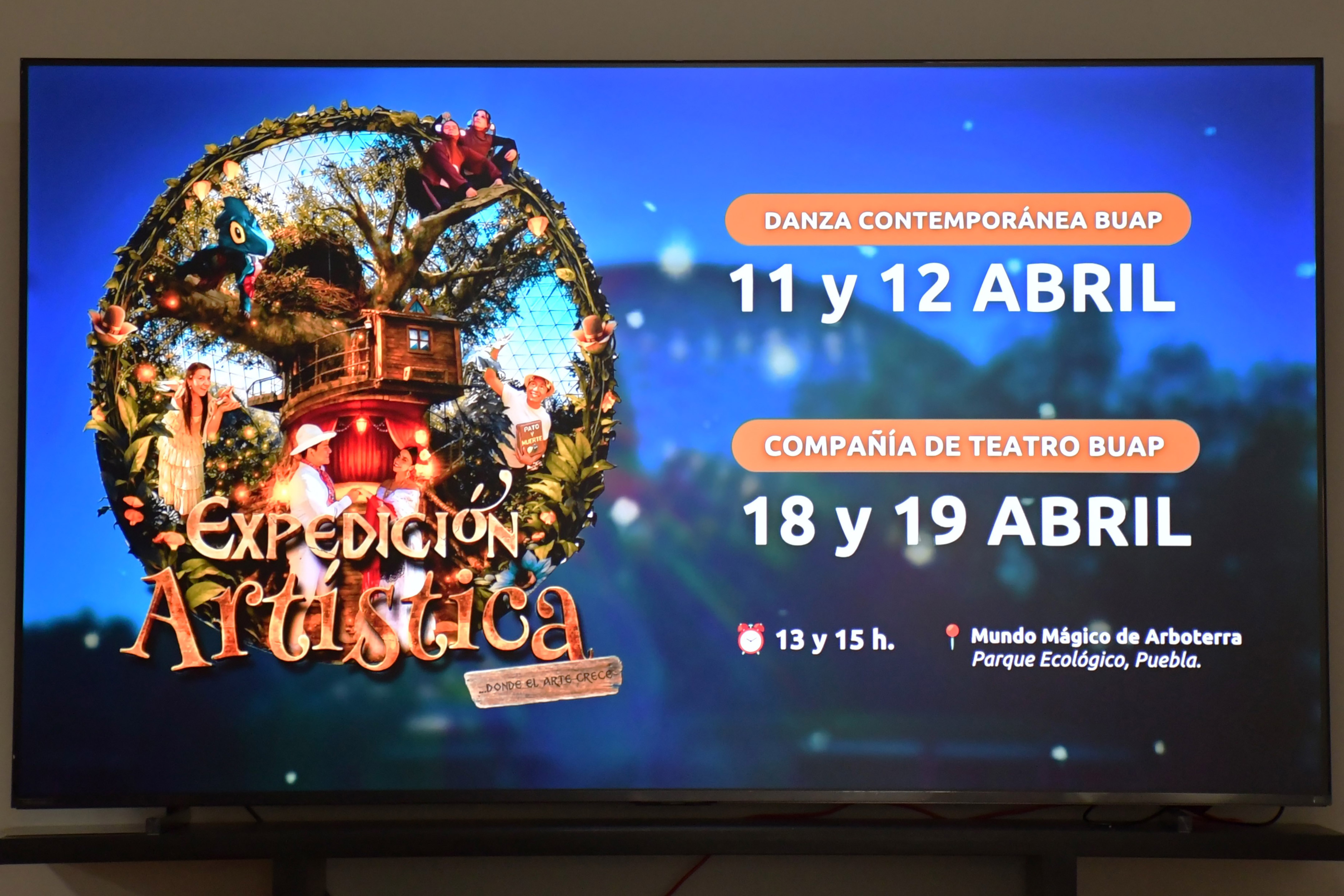 - El Complejo Cultural Universitario de la BUAP, en coordinación con ArboTerra, parque temático y Africam Safari, presentó el programa “Expedición artística… donde el arte crece”, el cual se llevará a cabo los días 11,12, 18, 19, 25 y 26 de abril, con dos funciones gratuitas por día, en los horarios de 13 y 15 horas.